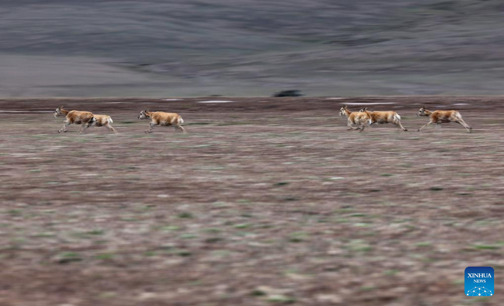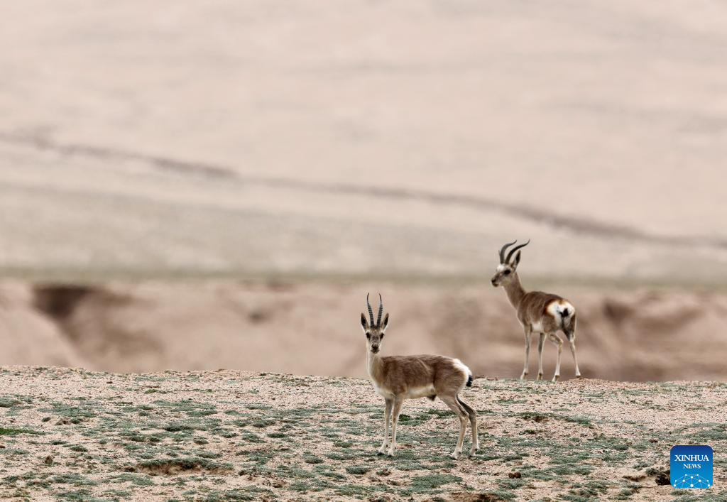This photo taken on July 1, 2023 shows Tibetan gazelles in the Altun Mountains National Nature Reserve in northwest China's Xinjiang Uygur Autonomous Region. (Xinhua/Cai Yang)