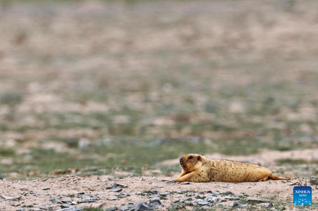This photo taken on June 30, 2023 shows a Himalayan marmot (Marmota himalayana) in the Altun Mountains National Nature Reserve in northwest China's Xinjiang Uygur Autonomous Region. (Xinhua/Cai Yang)