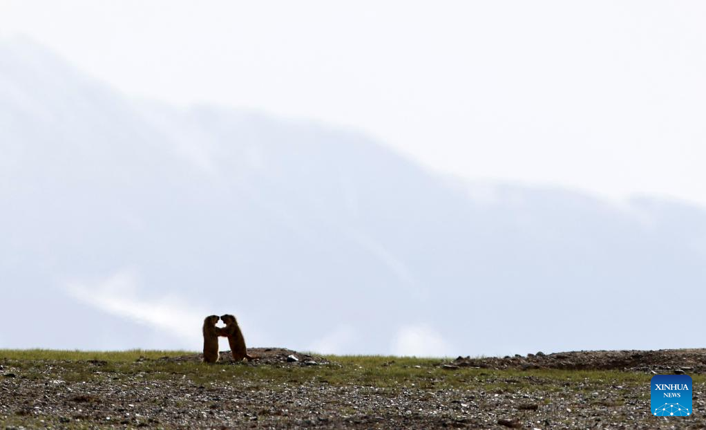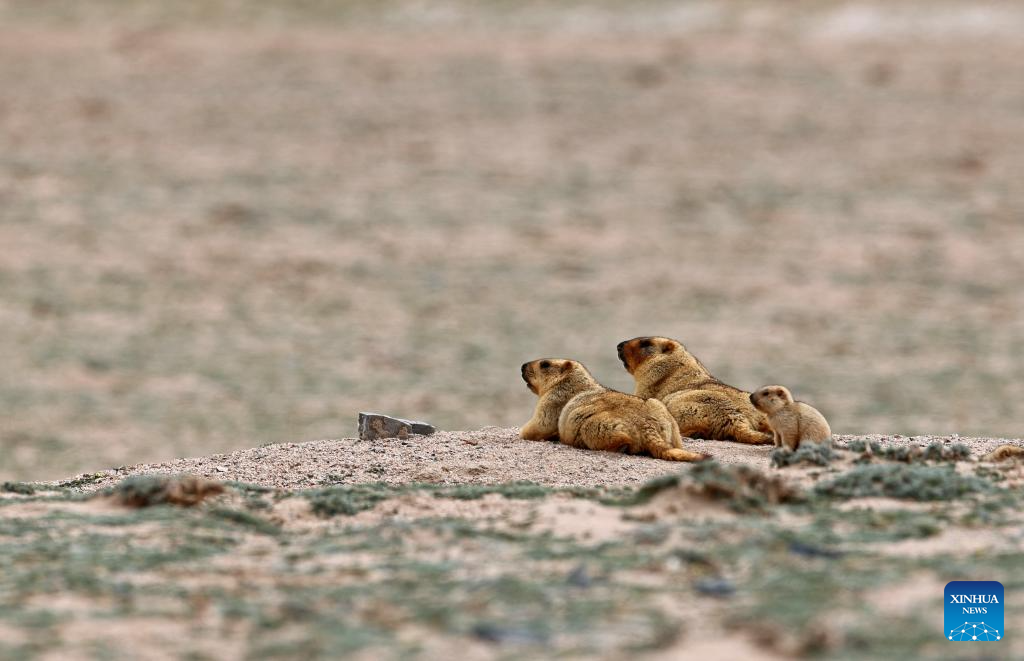This photo taken on July 5, 2023 shows Himalayan marmots (Marmota himalayana) in the Altun Mountains National Nature Reserve in northwest China's Xinjiang Uygur Autonomous Region. (Xinhua/Wang Peng)