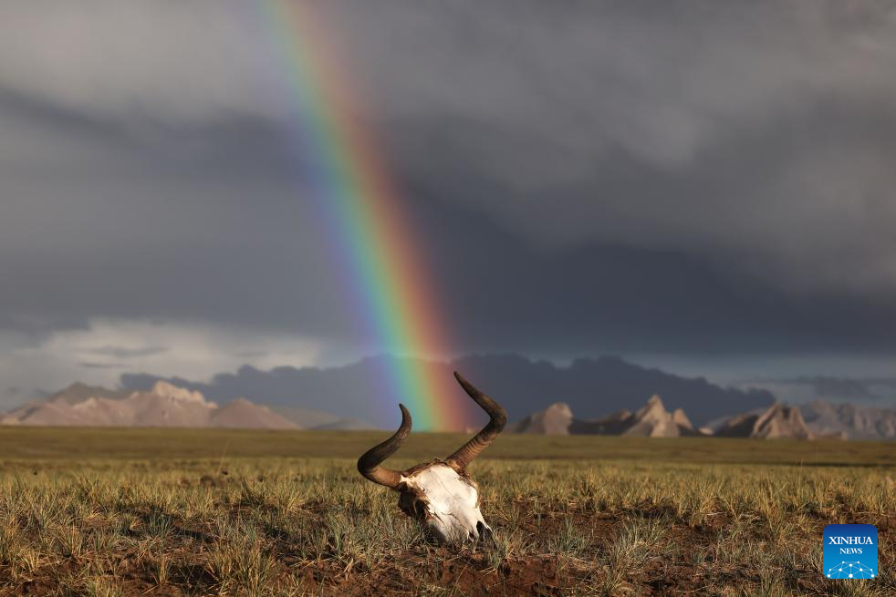 This photo taken on July 10, 2023 shows the skull of a wild yak in the Altun Mountains National Nature Reserve in northwest China's Xinjiang Uygur Autonomous Region. (Xinhua/Wang Peng)