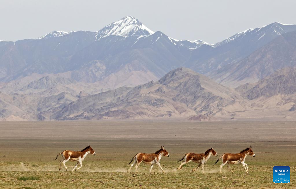This photo taken on June 30, 2023 shows Tibetan wild donkeys in the Altun Mountains National Nature Reserve in northwest China's Xinjiang Uygur Autonomous Region. (Xinhua/Cai Yang)