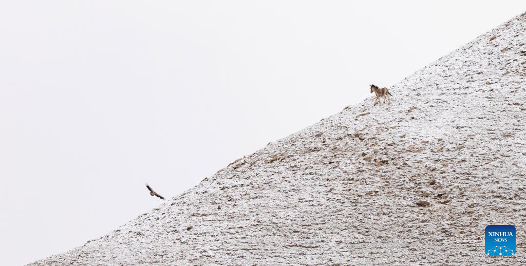 This photo taken on July 2, 2023 shows a Tibetan wild donkey and a Himalayan griffon vulture in the Altun Mountains National Nature Reserve in northwest China's Xinjiang Uygur Autonomous Region. (Xinhua/Cai Yang)