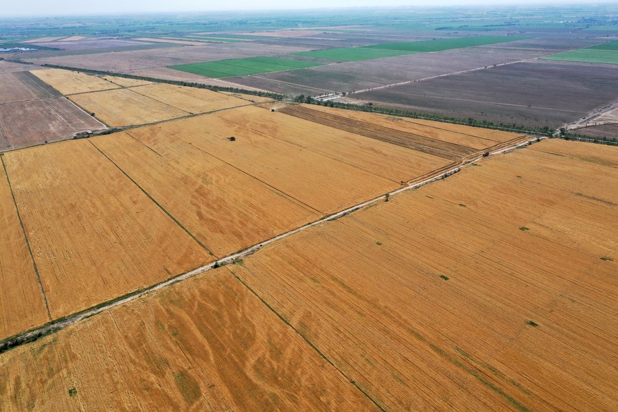 This aerial photo taken on July 15, 2023 shows wheat fields in Hutubi County, northwest China's Xinjiang Uygur Autonomous Region. (Xinhua/Ding Lei)