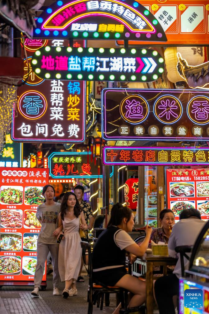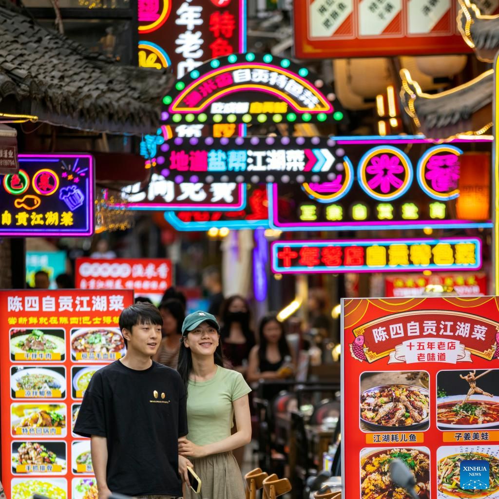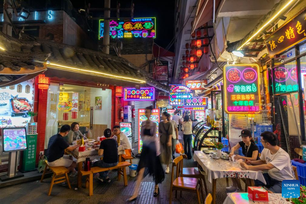 People are seen on a gourmet street in Chengdu of southwest China's Sichuan Province, on June 11, 2023. The 31st FISU Summer World University Games is scheduled to take place in Chengdu from July 28 to August 8, 2023. (Xinhua/Shen Bohan)