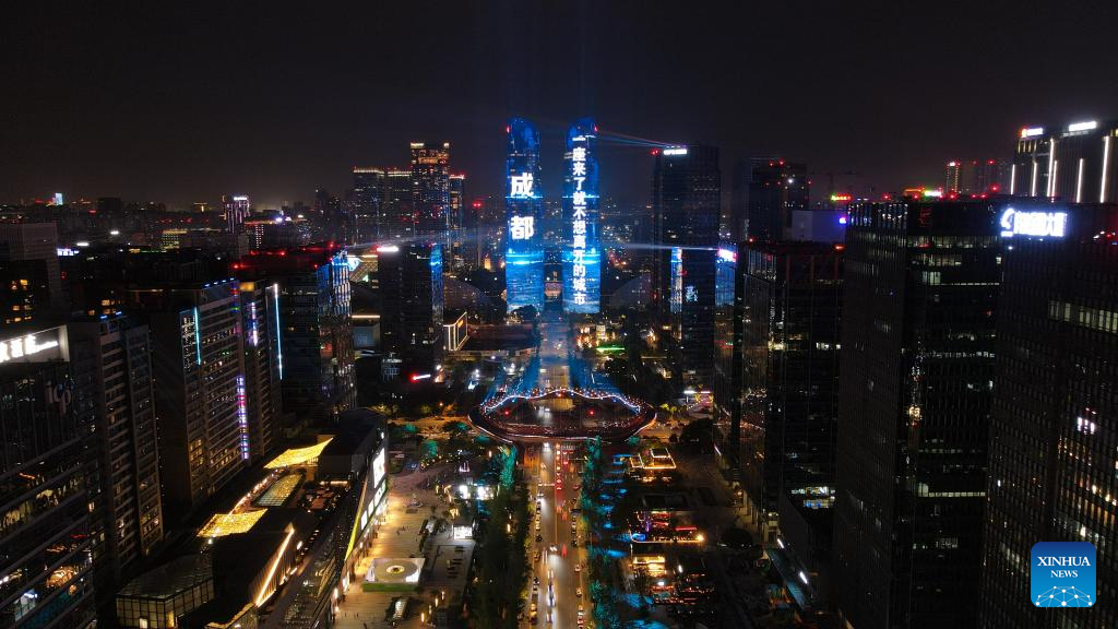 This aerial photo taken on July 14, 2023 shows the night view in Chengdu of southwest China's Sichuan Province. The 31st FISU Summer World University Games is scheduled to take place in Chengdu from July 28 to August 8, 2023. (Xinhua/Xu Bingjie)