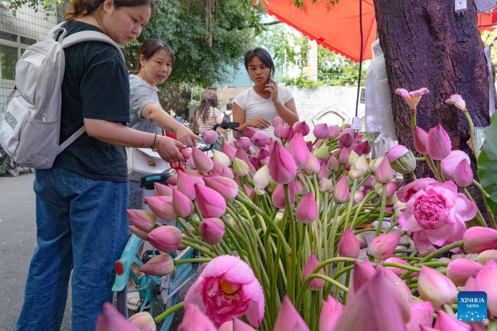 People choose lotus buds at a flower stall in Chengdu of southwest China's Sichuan Province, on July 14, 2023. The 31st FISU Summer World University Games is scheduled to take place in Chengdu from July 28 to August 8, 2023. (Xinhua/Tang Wenhao)
