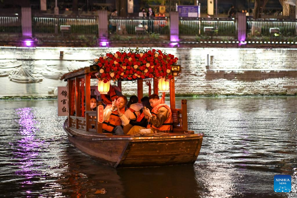 Visitors are seen on a tourist boat on the Jinjiang River in Chengdu of southwest China's Sichuan Province, on March 1, 2023. The 31st FISU Summer World University Games is scheduled to take place in Chengdu from July 28 to August 8, 2023. (Xinhua/Tang Wenhao)