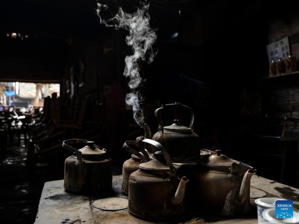 This photo taken on Nov. 23, 2021 shows the hot water kettles in a tea house in Chengdu of southwest China's Sichuan Province. The 31st FISU Summer World University Games is scheduled to take place in Chengdu from July 28 to August 8, 2023. (Xinhua/Shen Bohan)