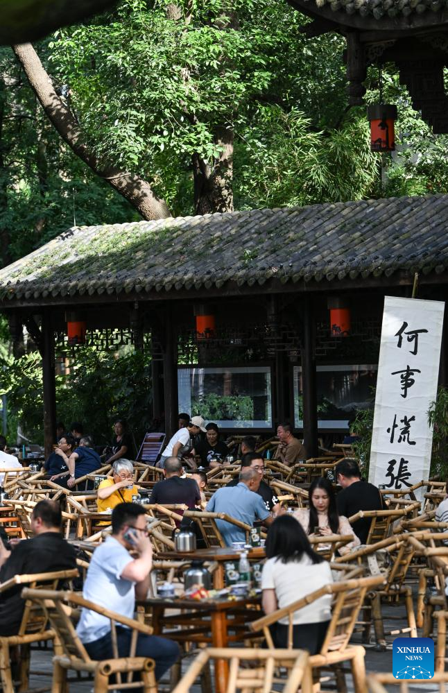 People enjoy tea at an open tea house in Chengdu of southwest China's Sichuan Province, on July 14, 2023. The 31st FISU Summer World University Games is scheduled to take place in Chengdu from July 28 to August 8, 2023. (Xinhua/Wang Xi)