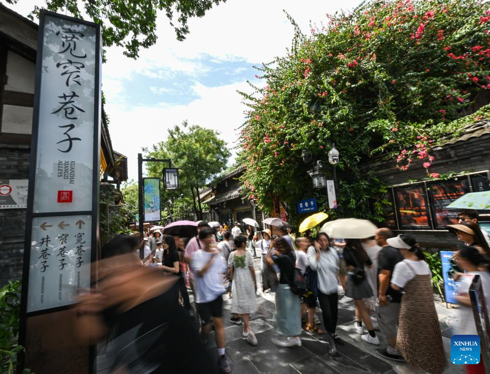 Tourists visit the Kuanzhai Alley Historic District in Chengdu of southwest China's Sichuan Province, on July 14, 2023. The 31st FISU Summer World University Games is scheduled to take place in Chengdu from July 28 to August 8, 2023. (Xinhua/Wang Xi)