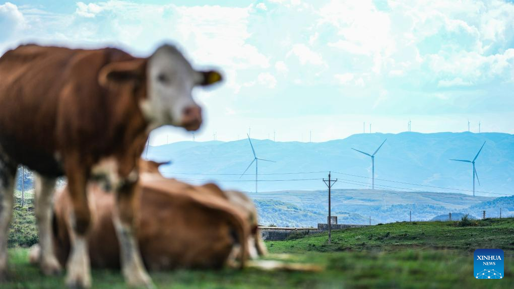Oxen rest on a grassland under wind power turbines in Xueshan Town of Weining Yi, Hui and Miao Autonomous County in southwest China's Guizhou Province, July 13, 2023. (Xinhua/Tao Liang)
