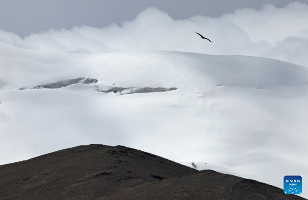 A vulture flies over snow mountains in the Altun Mountains National Nature Reserve in northwest China's Xinjiang Uygur Autonomous Region, July 8, 2023. With an average altitude of 4,580 meters, the Altun Mountains National Nature Reserve covers a total area of 45,000 square kilometers and is a representative of plateau desert ecosystem in China. (Xinhua/Wang Peng)