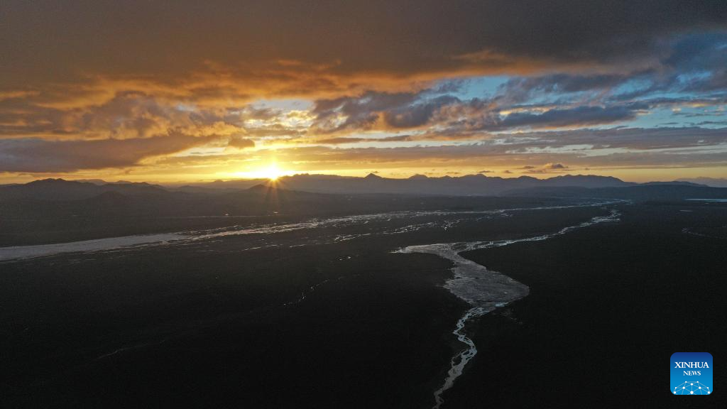This aerial photo taken on July 6, 2023 shows a sunset view in the Altun Mountains National Nature Reserve in northwest China's Xinjiang Uygur Autonomous Region. With an average altitude of 4,580 meters, the Altun Mountains National Nature Reserve covers a total area of 45,000 square kilometers and is a representative of plateau desert ecosystem in China. (Xinhua/Wang Peng)