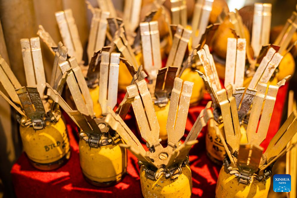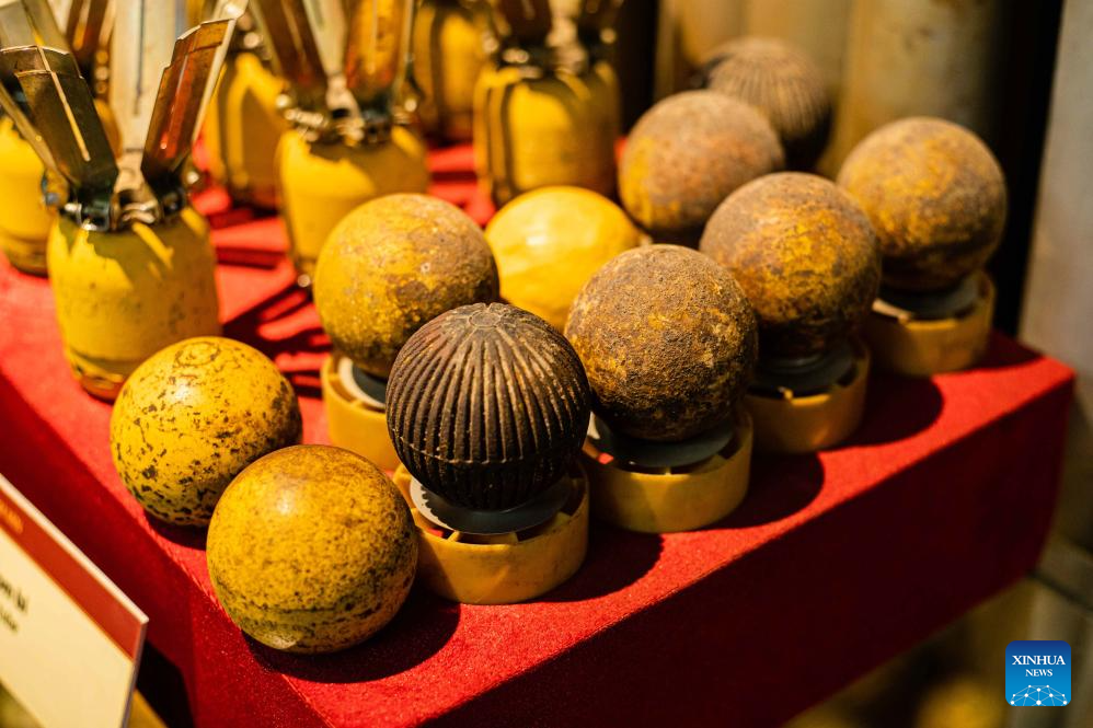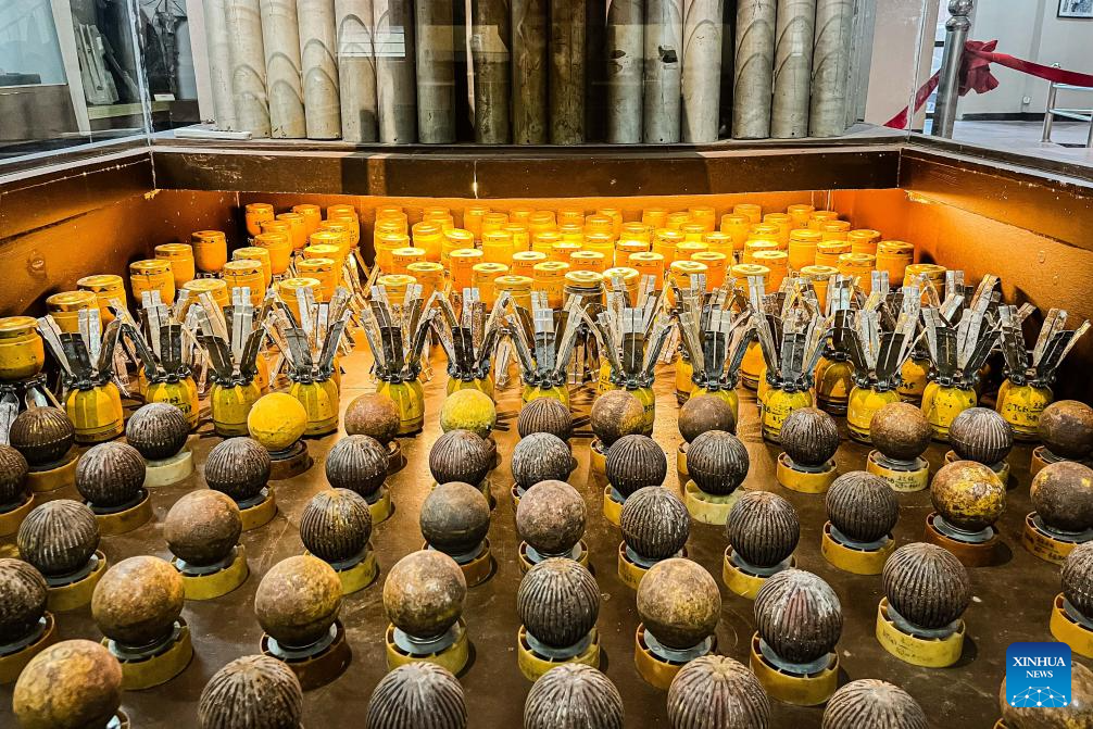 This photo taken on July 14, 2023 shows cluster bomblets left by the U.S. military during the Vietnam war at a museum in Hanoi, Vietnam.(Photo by Pham Dinh Duc/Xinhua)