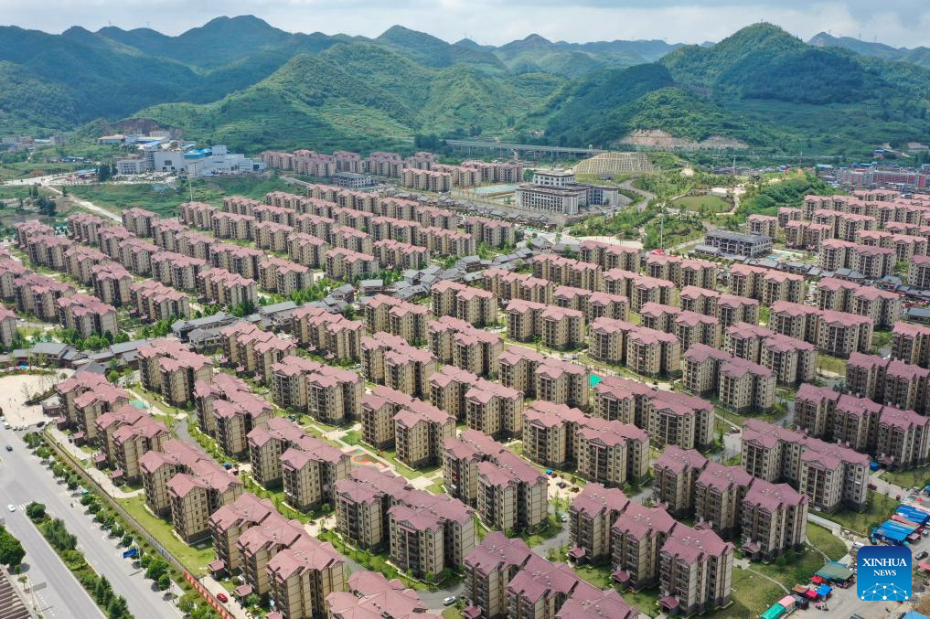 This aerial photo taken on July 13, 2023 shows a view of the Baiyanglin sub-district in Bijie City of southwest China's Guizhou Province. Baiyanglin sub-district, home to nearly 30,000 residents, is the largest single relocation site for poverty alleviation in Guizhou. In addition to mobilizing all possible resources to improve employment and income for the residents, local authorities managed to build and operate a number of schools, kindergartens, day care centers, and clinics for the young, the aged, and the ailing ones. (Xinhua/Liu Xu)