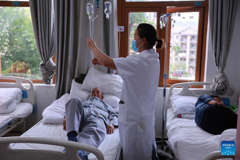 A medical worker tends a patient at a community clinic in Baiyanglin sub-district in Bijie City of southwest China's Guizhou Province, July 13, 2023. Baiyanglin sub-district, home to nearly 30,000 residents, is the largest single relocation site for poverty alleviation in Guizhou. In addition to mobilizing all possible resources to improve employment and income for the residents, local authorities managed to build and operate a number of schools, kindergartens, day care centers, and clinics for the young, the aged, and the ailing ones. (Xinhua/Liu Xu)