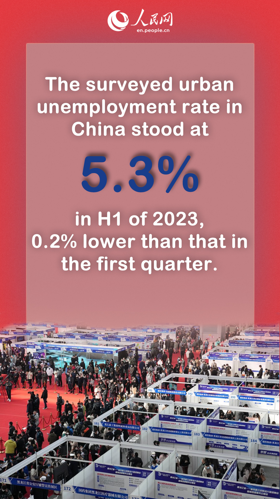 The surveyed urban unemployment rate in China stood at 5.3% in H1 of 2023, 0.2% lower than that in the first quarter.