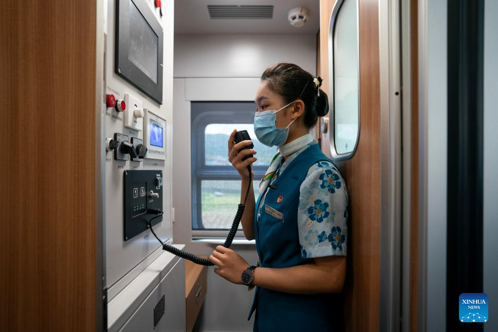 Yi Bofeng (C) serves passengers aboard the train D887 on July 16, 2023. (Xinhua/Chen Xinbo)