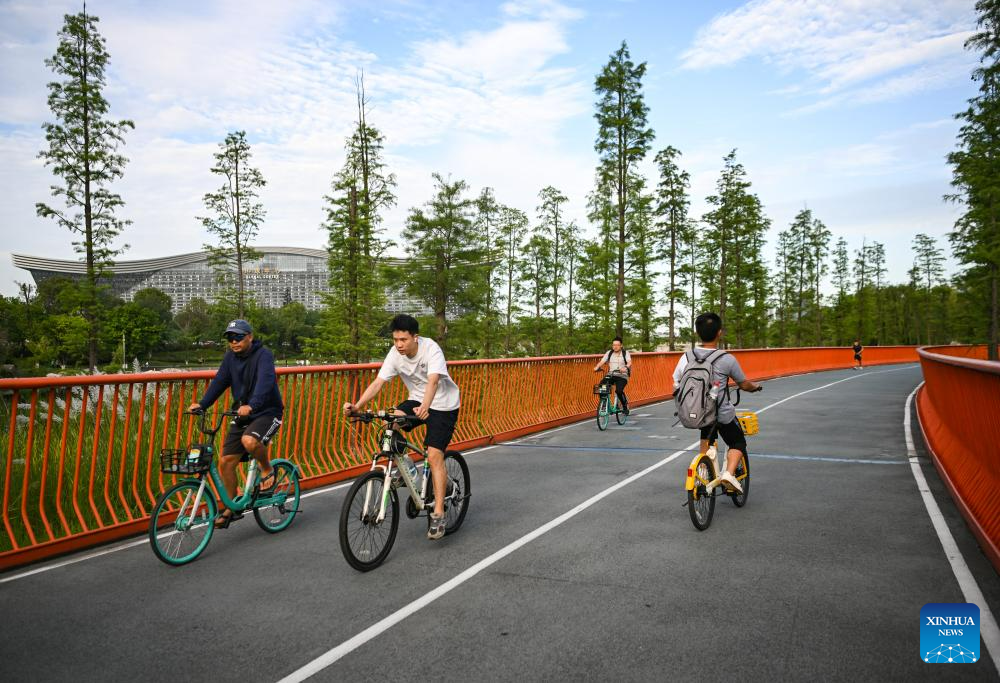 People do exercise at Tianfu Greenway in Chengdu, capital of southwest China's Sichuan Province, July 16, 2023. The 31st International University Sports Federation (FISU) Summer World University Games will be held in Chengdu from July 28 to August 8. (Xinhua/Xu Bingjie)