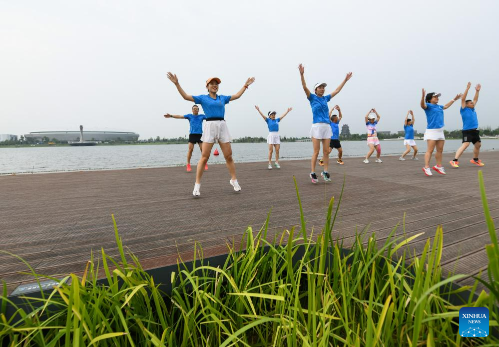 People do exercises at a park in Chengdu, capital of southwest China's Sichuan Province, July 12, 2023. The 31st International University Sports Federation (FISU) Summer World University Games will be held in Chengdu from July 28 to August 8. (Xinhua/Wang Xi)