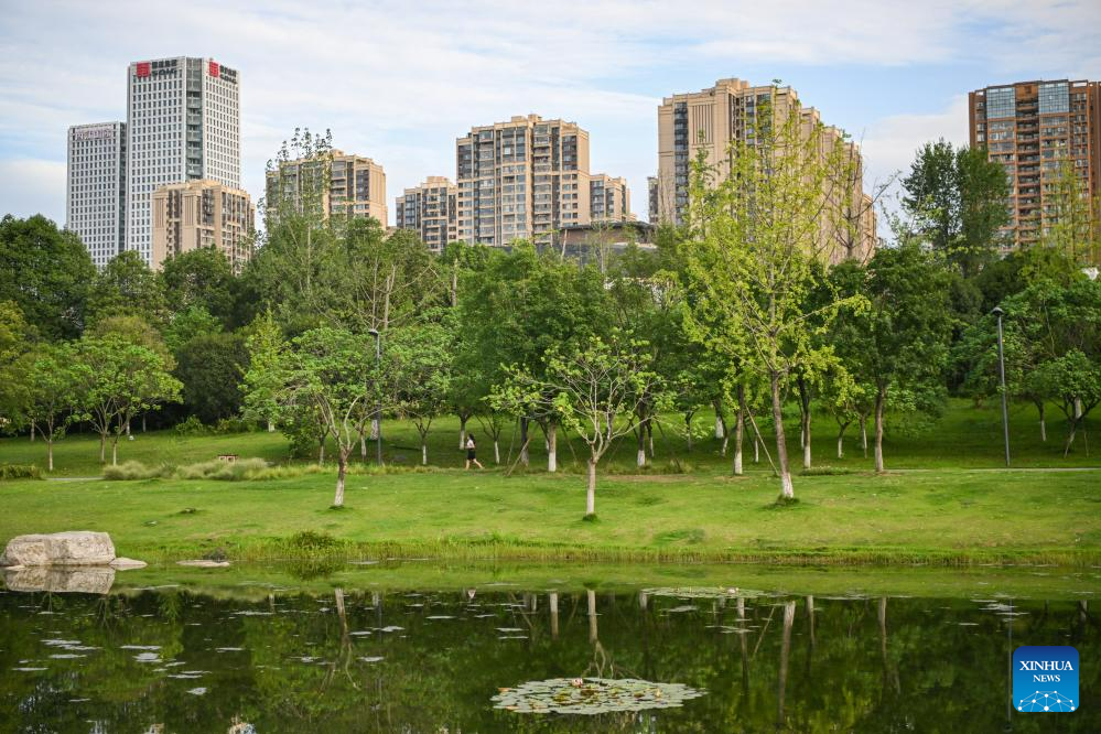 A citizen walks in a park in Chengdu, capital of southwest China's Sichuan Province, April 24, 2023. The 31st International University Sports Federation (FISU) Summer World University Games will be held in Chengdu from July 28 to August 8. (Xinhua/Tang Wenhao)