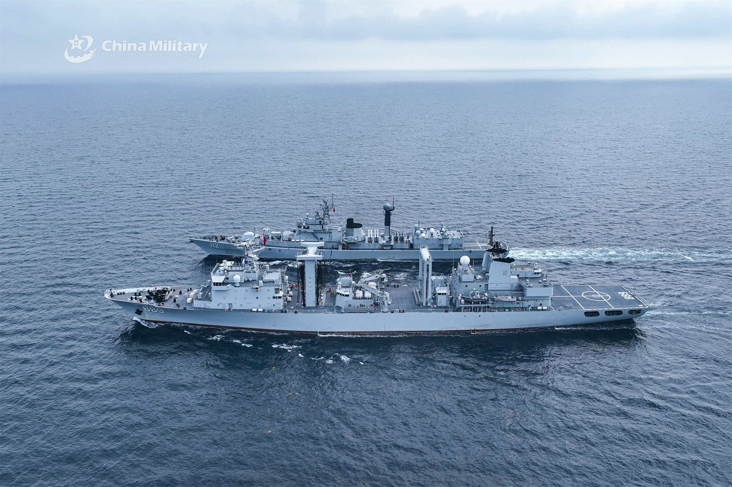 Warships attached to a combat support ship flotilla of the navy under the PLA Northern Theater Command steam in formation to conduct alongside replenishment-at-sea during a recent comprehensive replenishment training exercise. (eng.chinamil.com.cn/Photo by Xu Taotao)