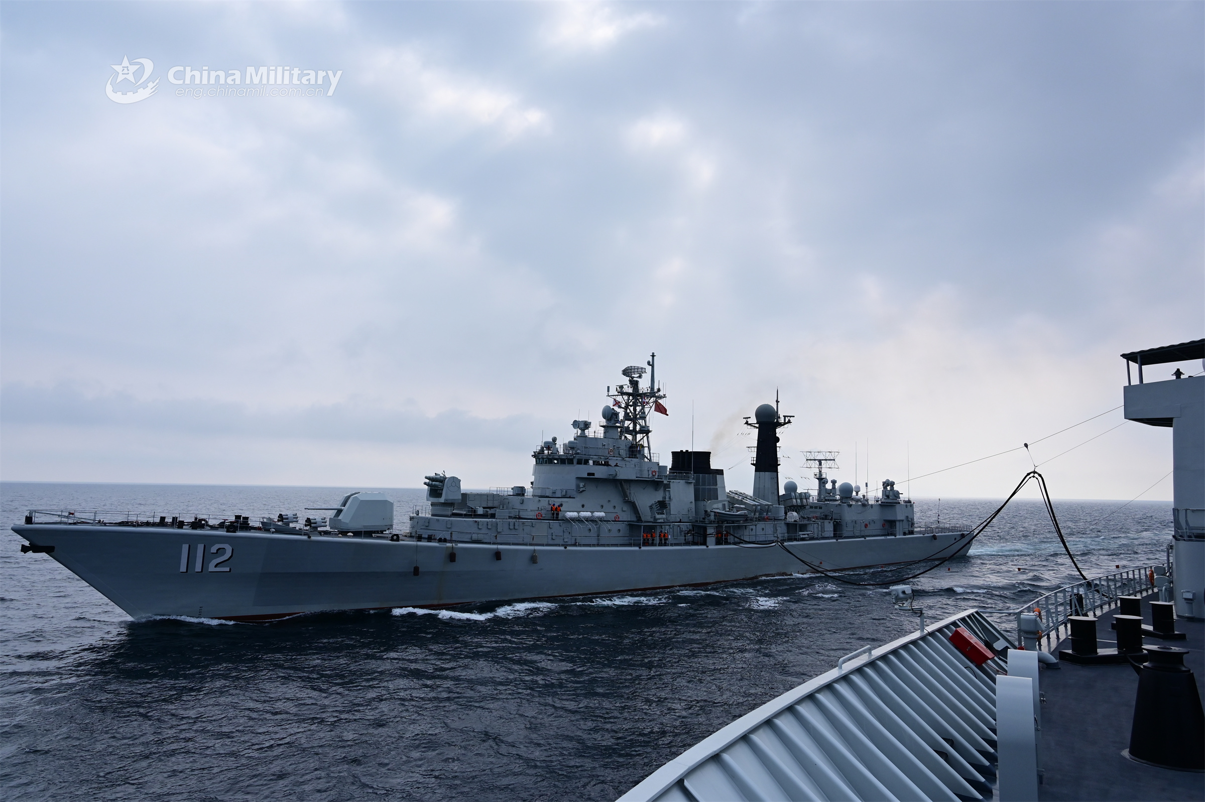Warships attached to a combat support ship flotilla of the navy under the PLA Northern Theater Command steam in formation to conduct alongside replenishment-at-sea during a recent comprehensive replenishment training exercise. (eng.chinamil.com.cn/Photo by Xu Taotao)