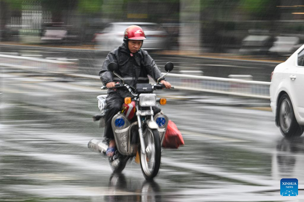 A man rides a motorcycle in rain in Wenchang, south China's Hainan Province, July 17, 2023. South China's island province of Hainan resumed the operation of flights and the Hainan Roundabout Railway on Tuesday, as Typhoon Talim, the fourth this year, weakened to the level of a tropical storm, said local authorities on Tuesday. (Xinhua/Pu Xiaoxu)