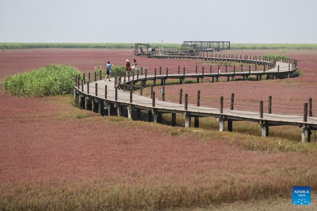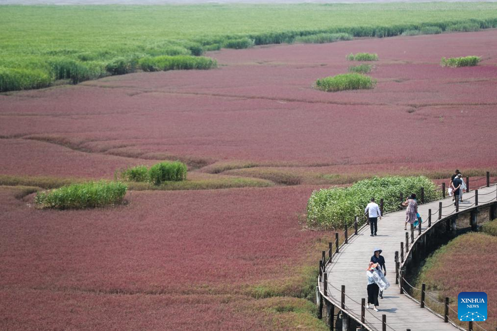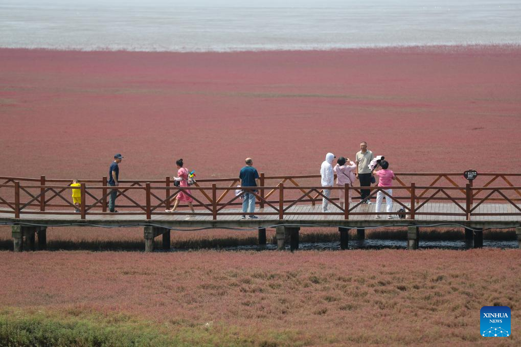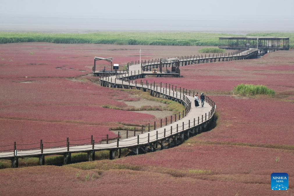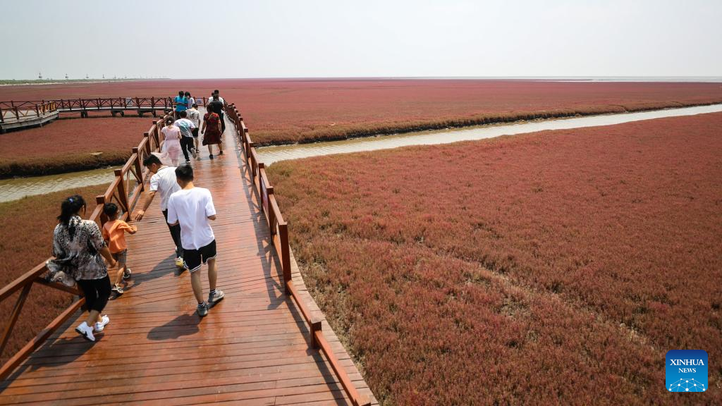 Tourists visit the Honghaitan Red Beach scenic area in Panjin, northeast China's Liaoning Province, July 19, 2023. The Honghaitan Red Beach is famous for its landscapes featuring the red plant of Suaeda salsa, one of the few species of plant that can live in highly alkaline soil. (Xinhua/Pan Yulong)
