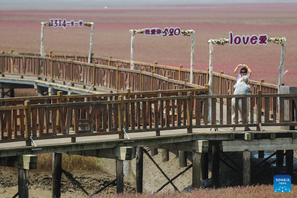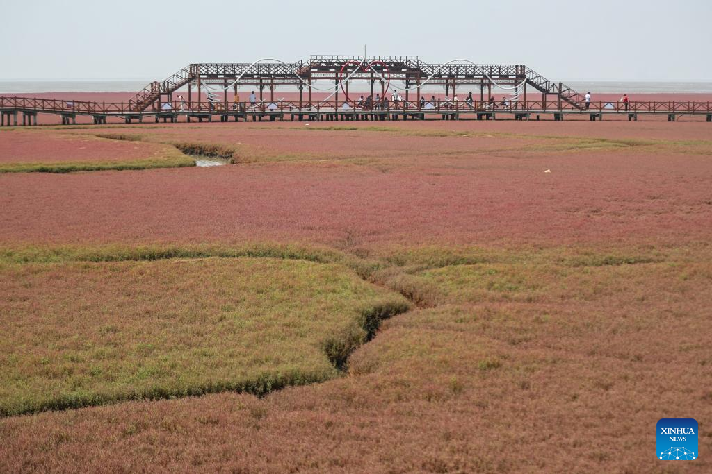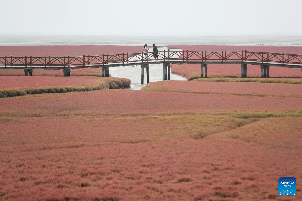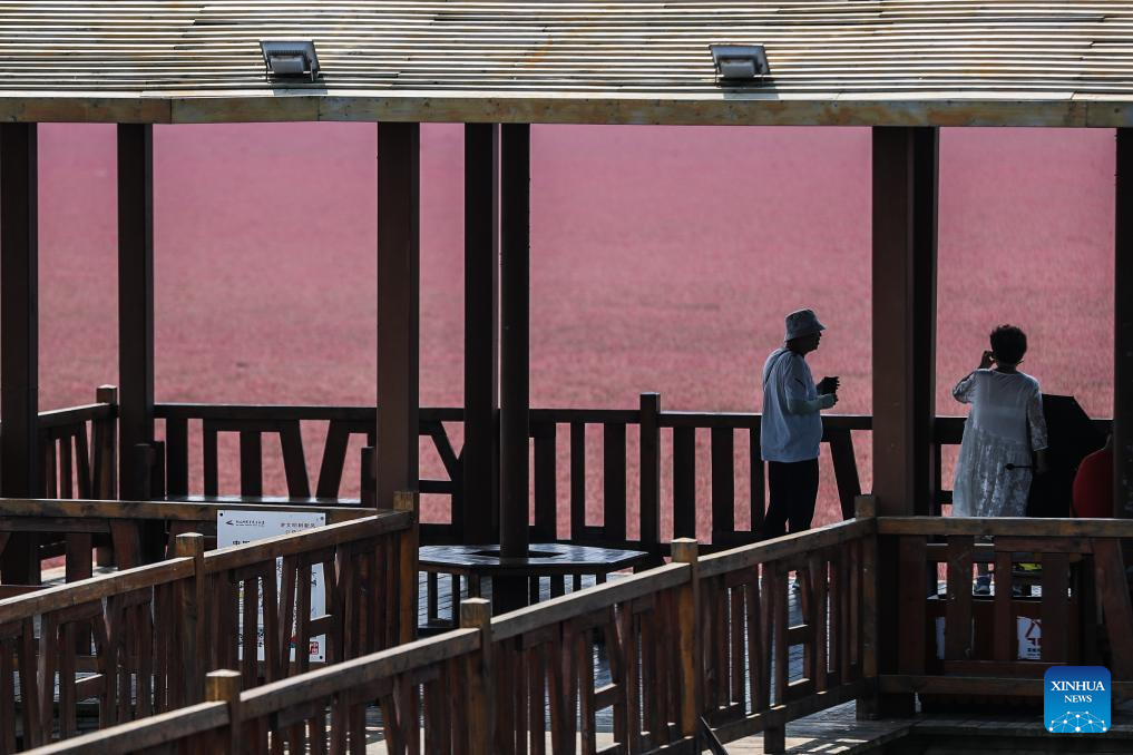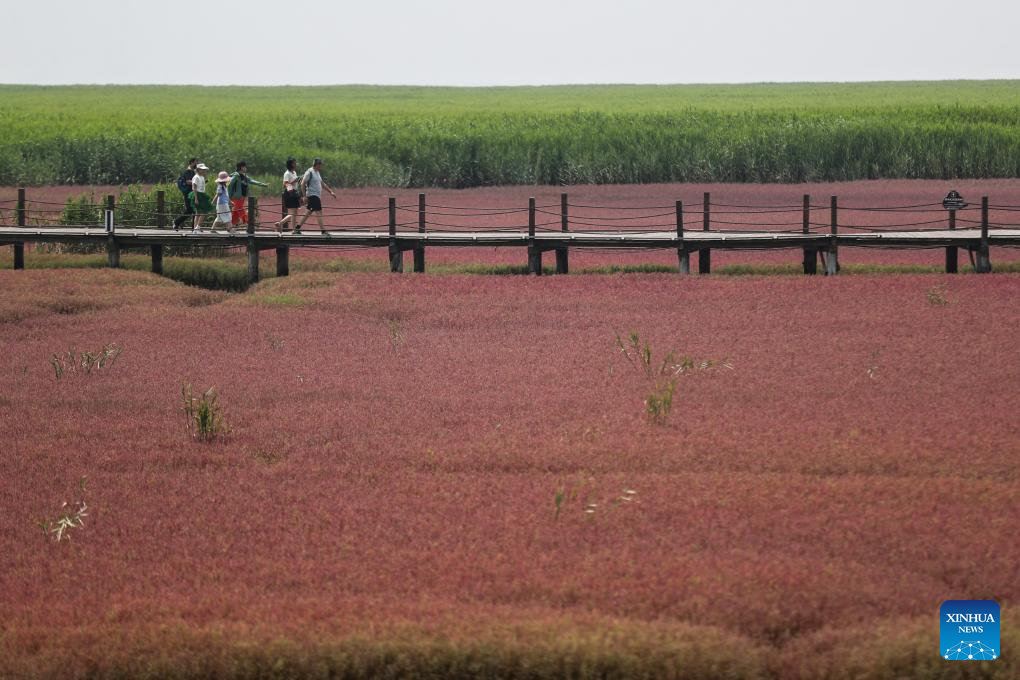 Tourists visit the Honghaitan Red Beach scenic area in Panjin, northeast China's Liaoning Province, July 19, 2023. The Honghaitan Red Beach is famous for its landscapes featuring the red plant of Suaeda salsa, one of the few species of plant that can live in highly alkaline soil. (Xinhua/Pan Yulong)