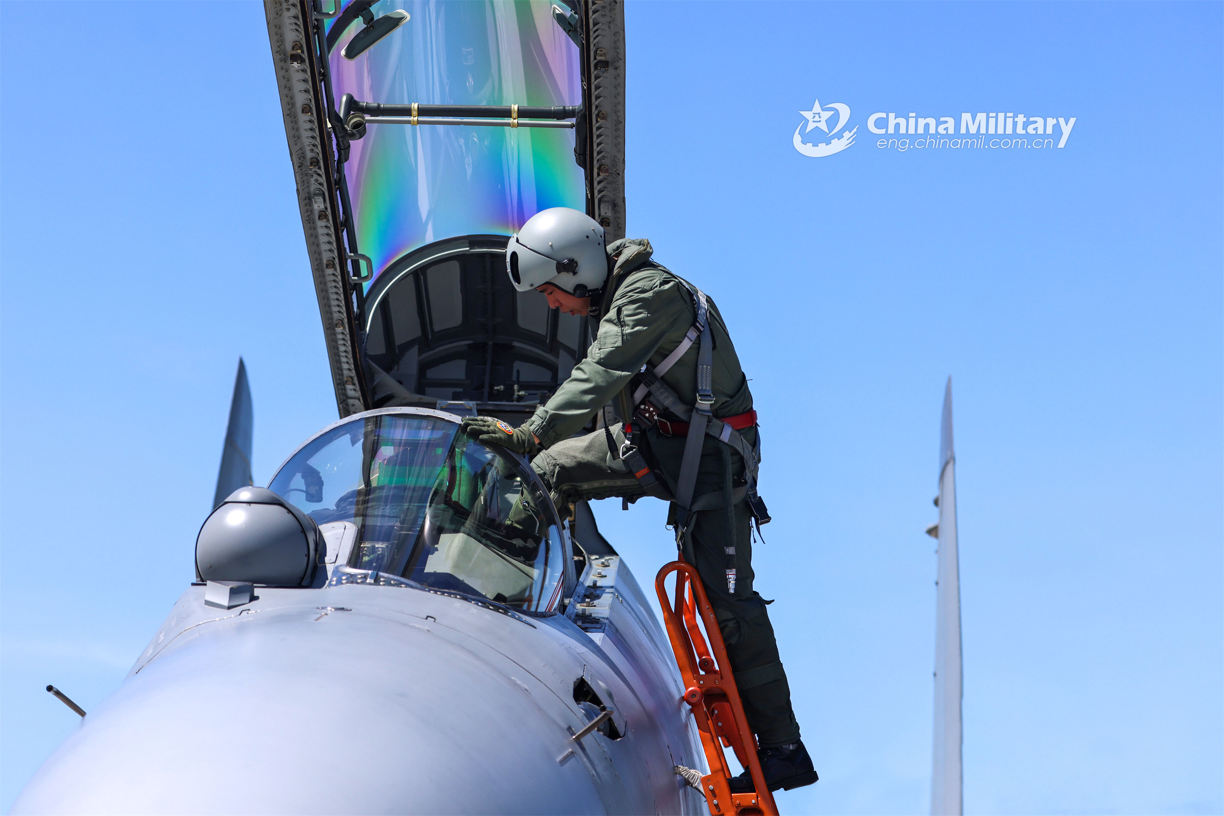 Pilot assigned to an aviation brigade with the air force under the PLA Southern Theater Command climbs into the cockpit of a fighter jet to get ready for an air refueling training exercise in early July, 2023. (eng.chinamil.com.cn/Photo by Hao Hunan)