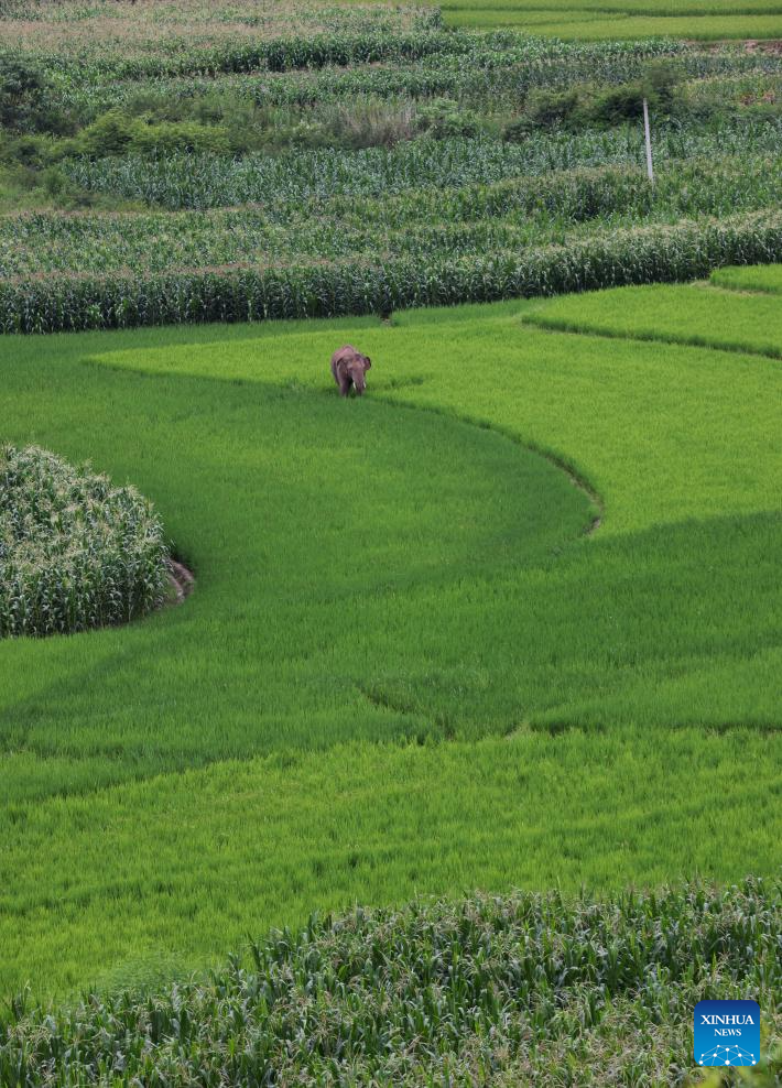 An Asian elephant eats in rice and corn fields in Jiangcheng Hani and Yi Autonomous County of Pu'er, southwest China's Yunnan Province, July 19, 2023. (Xinhua/Cui Wen)