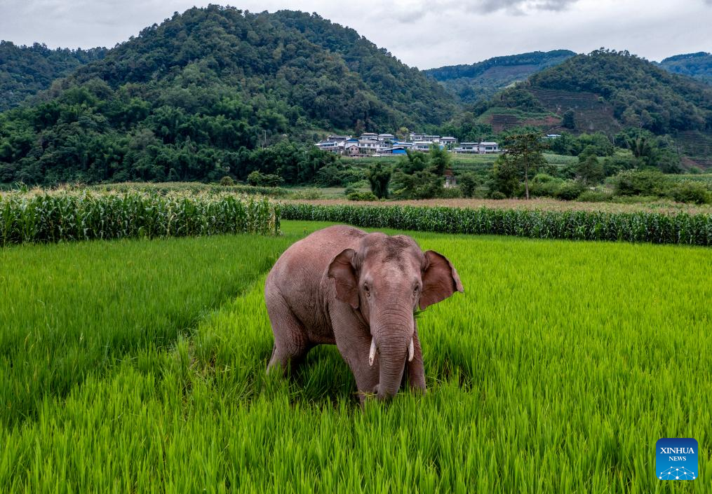 An Asian elephant eats in rice fields in Jiangcheng Hani and Yi Autonomous County of Pu'er, southwest China's Yunnan Province, July 19, 2023. (Xinhua/Fei Maohua)