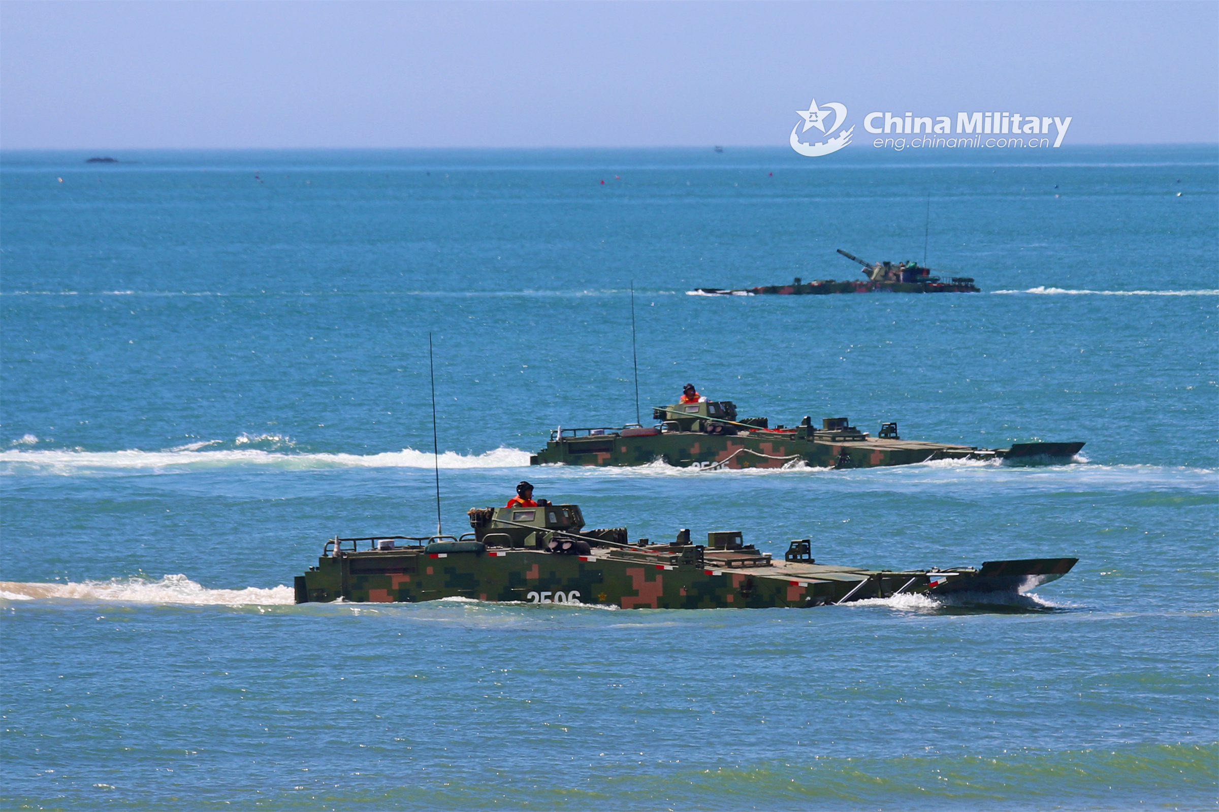 Amphibious armored vehicles attached to an amphibious armored element of a brigade under the PLA 73rd Group Army conduct waterborne operations during a recent real-combat training exercise. (eng.chinamil.com.cn/Photo by Lai Kun)