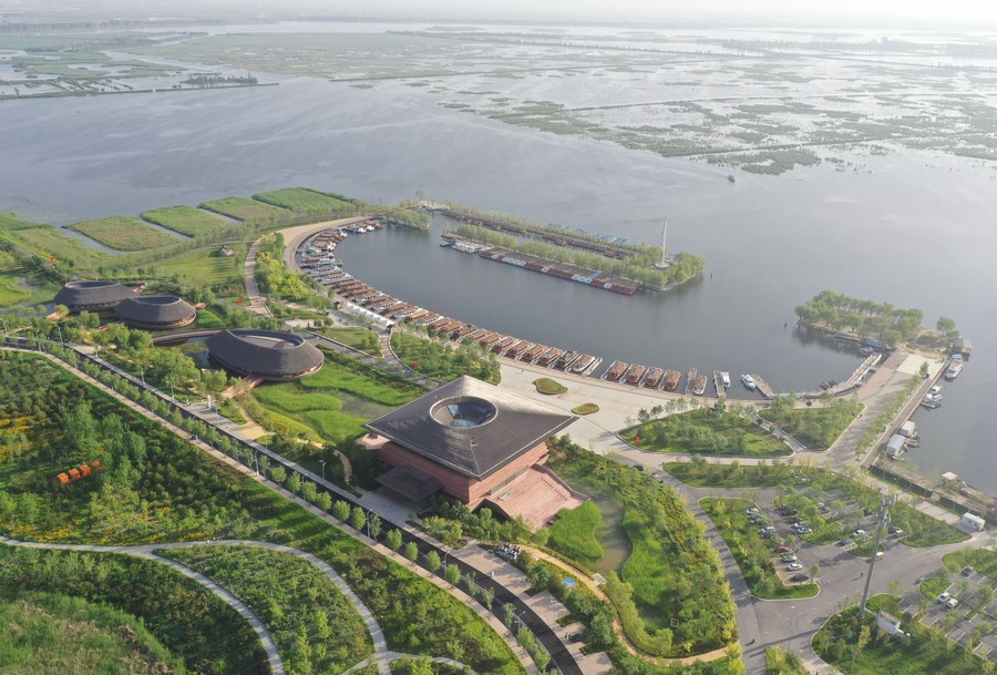 This aerial photo taken on June 1, 2023 shows the tourist dock of Baiyangdian Lake in Xiong'an New Area, north China's Hebei Province. (Xinhua/Zhu Xudong)
