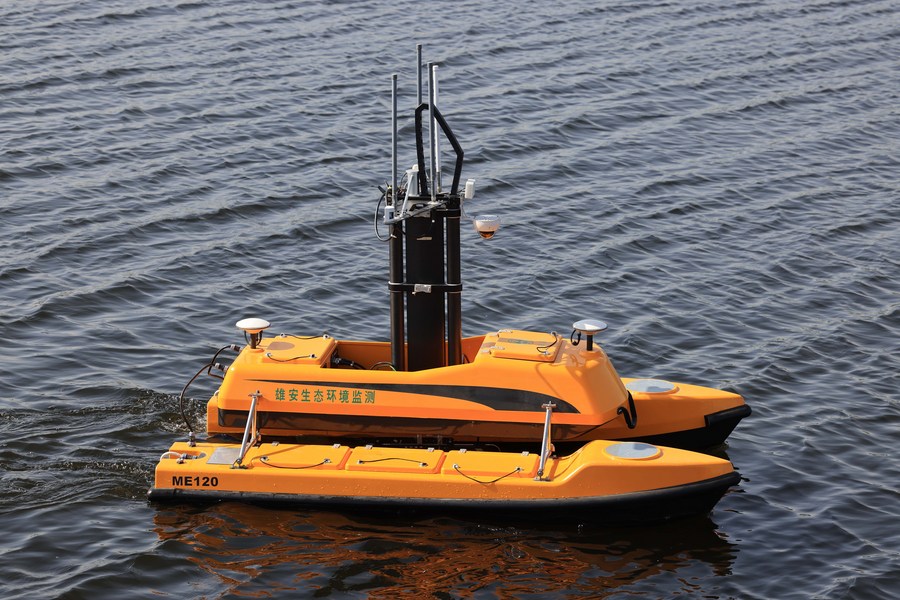 The photo taken on Nov. 5, 2022 shows an unmanned ship conducting monitoring operations on the Baiyangdian Lake, Xiong'an New Area, north China's Hebei Province.(Xinhua/Zhu Xudong)