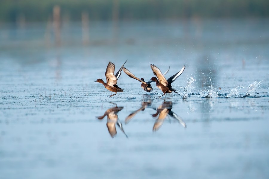 Photo taken on Sept. 9, 2022 shows wild pochards in Baiyangdian Lake in Xiong'an New Area, north China's Hebei Province. (Photo by Liu Xun/Xinhua)
