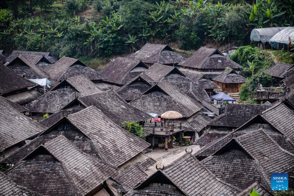 This photo taken on July 19, 2023 shows the Nuogan Village of Lancang Lahu Autonomous County, southwest China's Yunnan Province. In recent years, Lancang Lahu Autonomous County has harnessed its rich cultural and tourism resources, promoting high-quality integration of culture and tourism through industrial linkage and improving service systems. According to statistics, the county received over 3 million tourists from January to May in 2023, generating a comprehensive tourism revenue of 3.388 billion Yuan (about 0.47 billion U.S. dollars). (Xinhua/Hu Chao)