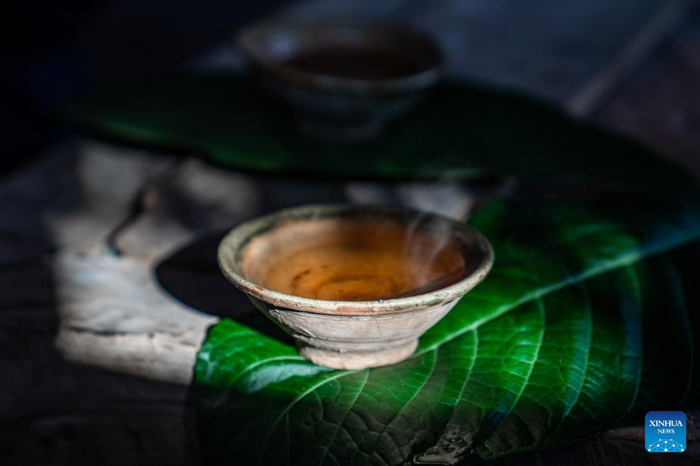 This photo taken on July 18, 2023 shows a cup of tea made by tea grower Nan Kang of Blang ethnic group at Huimin Township of Lancang Lahu Autonomous County, southwest China's Yunnan Province. In recent years, Lancang Lahu Autonomous County has harnessed its rich cultural and tourism resources, promoting high-quality integration of culture and tourism through industrial linkage and improving service systems. According to statistics, the county received over 3 million tourists from January to May in 2023, generating a comprehensive tourism revenue of 3.388 billion Yuan (about 0.47 billion U.S. dollars). (Xinhua/Hu Chao)