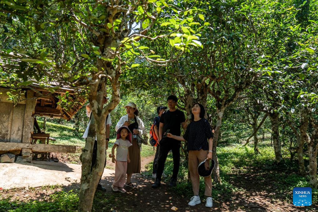 Tourists visit the ancient tea forests on Jingmai Mountain in Lancang Lahu Autonomous County, southwest China's Yunnan Province, July 18, 2023. In recent years, Lancang Lahu Autonomous County has harnessed its rich cultural and tourism resources, promoting high-quality integration of culture and tourism through industrial linkage and improving service systems. According to statistics, the county received over 3 million tourists from January to May in 2023, generating a comprehensive tourism revenue of 3.388 billion Yuan (about 0.47 billion U.S. dollars). (Xinhua/Hu Chao)