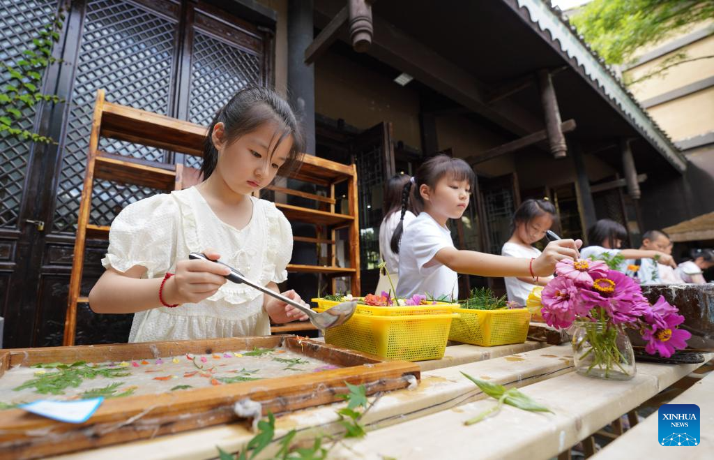 Children experience traditional papermaking technique in Danzhai County, Qiandongnan Miao and Dong Autonomous Prefecture, southwest China's Guizhou Province, July 21, 2023. (Photo by Yang Wukui/Xinhua)