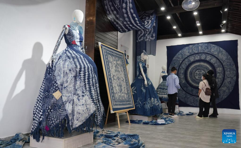 Tourists look at batik exhibits at a Miao batik intangible cultural heritage exhibition hall in Danzhai County, Qiandongnan Miao and Dong Autonomous Prefecture, southwest China's Guizhou Province, July 21, 2023. (Photo by Yang Shengxian/Xinhua)