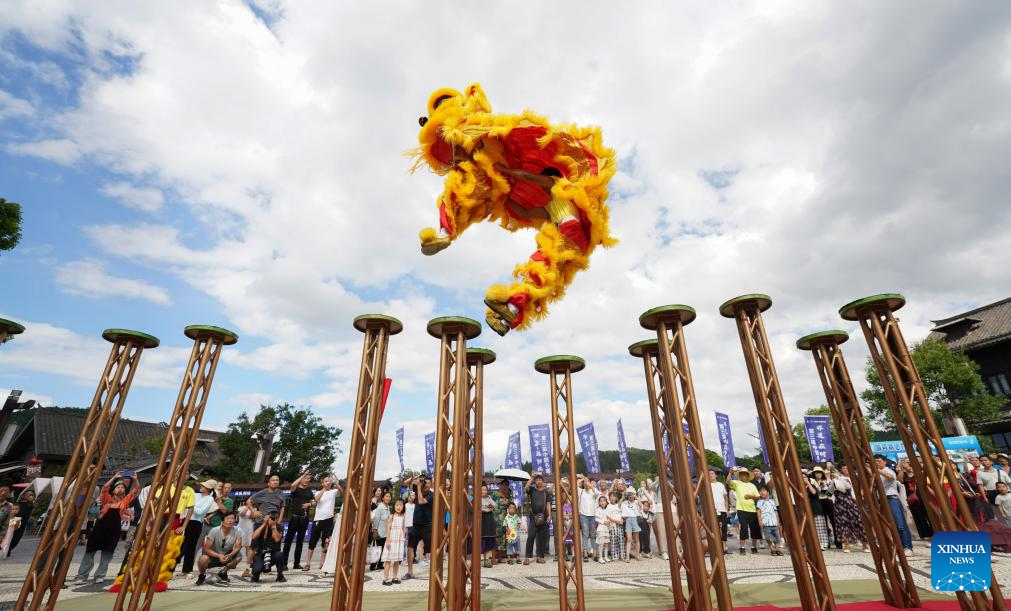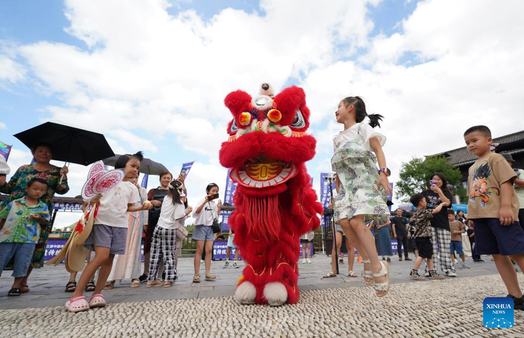 Tourists look at lion dance in Danzhai County, Qiandongnan Miao and Dong Autonomous Prefecture, southwest China's Guizhou Province, July 21, 2023. (Photo by Yang Wukui/Xinhua)