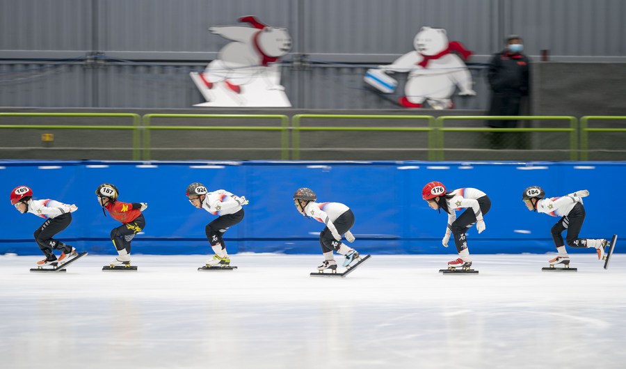 Young skaters participate in short track speeding training at Century Star Rink in Changping District of Beijing, capital of China, Feb. 15, 2022. (Xinhua/Cai Yang)