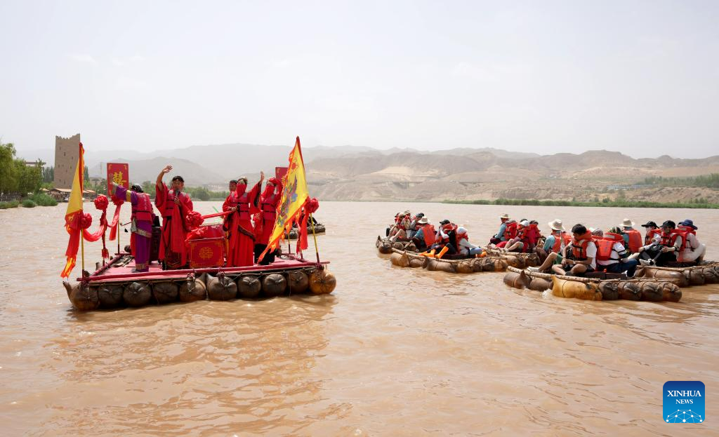 Actors perform "wedding ceremony on sheepskin rafts" at the Shapotou scenic spot in Zhongwei, northwest China's Ningxia Hui Autonomous Region, July 20, 2023. Shapotou scenic spot in Zhongwei of northwest China's Ningxia has entered its peak tourism season during the summer vacation, with the largest daily visitor flow reaching over 10,000. (Xinhua/Feng Kaihua)