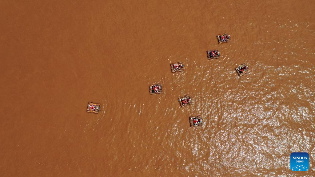 This aerial photo taken on July 20, 2023 shows visitors taking sheepskin rafts at the Shapotou scenic spot in Zhongwei, northwest China's Ningxia Hui Autonomous Region. Shapotou scenic spot in Zhongwei of northwest China's Ningxia has entered its peak tourism season during the summer vacation, with the largest daily visitor flow reaching over 10,000. (Xinhua/Wang Peng)