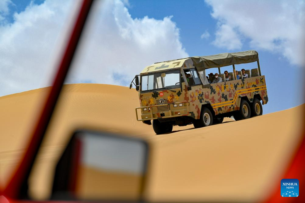 Visitors take a desert surfing vehicle at the Shapotou scenic spot in Zhongwei, northwest China's Ningxia Hui Autonomous Region, July 20, 2023. Shapotou scenic spot in Zhongwei of northwest China's Ningxia has entered its peak tourism season during the summer vacation, with the largest daily visitor flow reaching over 10,000. (Xinhua/Feng Kaihua)