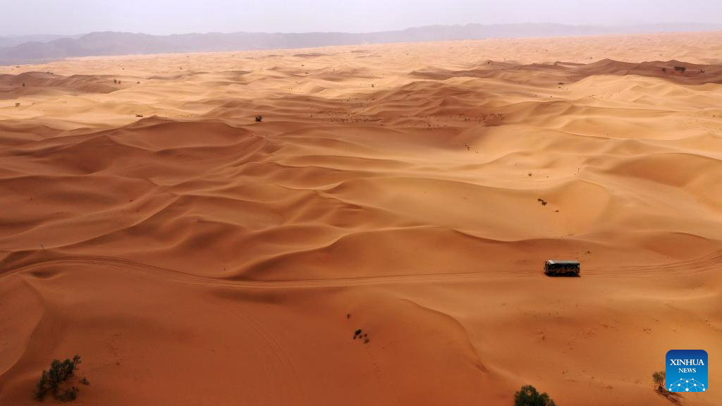 This aerial photo taken on July 20, 2023 shows visitors taking a desert surfing vehicle at the Shapotou scenic spot in Zhongwei, northwest China's Ningxia Hui Autonomous Region. Shapotou scenic spot in Zhongwei of northwest China's Ningxia has entered its peak tourism season during the summer vacation, with the largest daily visitor flow reaching over 10,000. (Xinhua/Wang Peng)