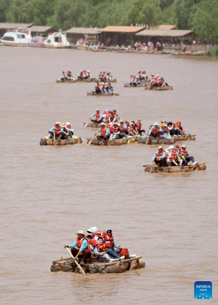 Visitors take sheepskin rafts at the Shapotou scenic spot in Zhongwei, northwest China's Ningxia Hui Autonomous Region, July 20, 2023. Shapotou scenic spot in Zhongwei of northwest China's Ningxia has entered its peak tourism season during the summer vacation, with the largest daily visitor flow reaching over 10,000. (Xinhua/Wang Yuguo)