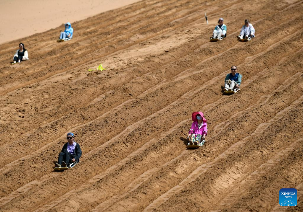 Visitors experience entertainment activities at the Shapotou scenic spot in Zhongwei, northwest China's Ningxia Hui Autonomous Region, July 20, 2023. Shapotou scenic spot in Zhongwei of northwest China's Ningxia has entered its peak tourism season during the summer vacation, with the largest daily visitor flow reaching over 10,000. (Xinhua/Wang Yuguo)